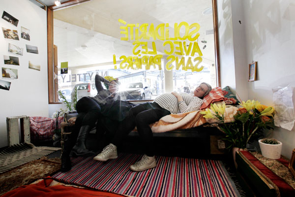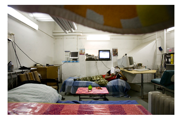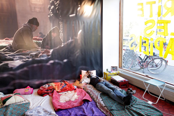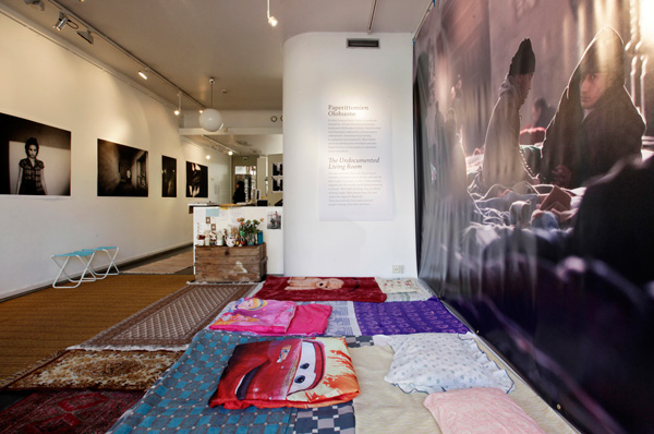 Lattialla on kirjavia patjoja. Viltit, teekupit, Koraanin ja Raamatun olemme saaneet lahjoituksena paperittomilta siirtolaisilta. Poliisin pelossa he eivät itse uskaltaudu paikalle, mutta heidän elämäntarinansa kuuluvat kaiuttimista. Seinillä on valokuvia luvattomista siirtolaisista eri puolilta Eurooppaa.