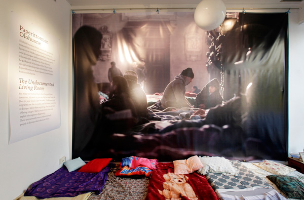 Avasimme Helsingin Lasipalatsiin kaikille avoimen Paperittomien olohuoneen. Kolmen viikon ajan ohikulkijat tulivat luoksemme juomaan teetä ja keskustelemaan luvattoman siirtolaisuuden eri puolista. Moni kuuli paperittomien ahdingosta ensimmäistä kertaa. Kolmen viikon aikana olkkarissa oli tarjolla teatteria, dokumenttielokuvia, pullaa ja musiikkia.